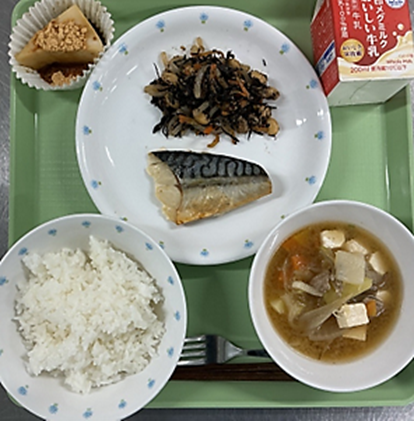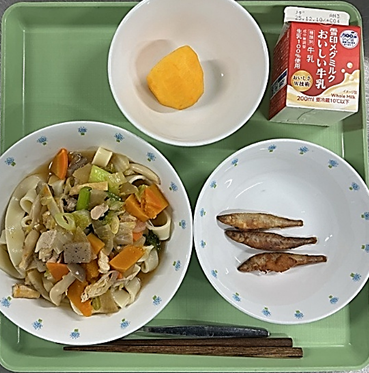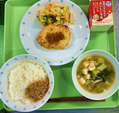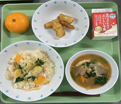 【今日の給食】さつま芋ご飯、肉豆腐、小松菜と白菜のお浸し、牛乳