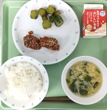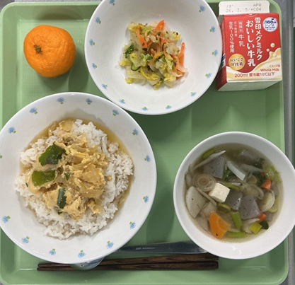【今日の給食】天丼、磯あえ、赤だしみそ汁、牛乳