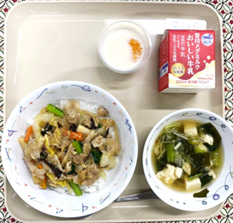【今日の給食】天丼、磯あえ、赤だしみそ汁、牛乳